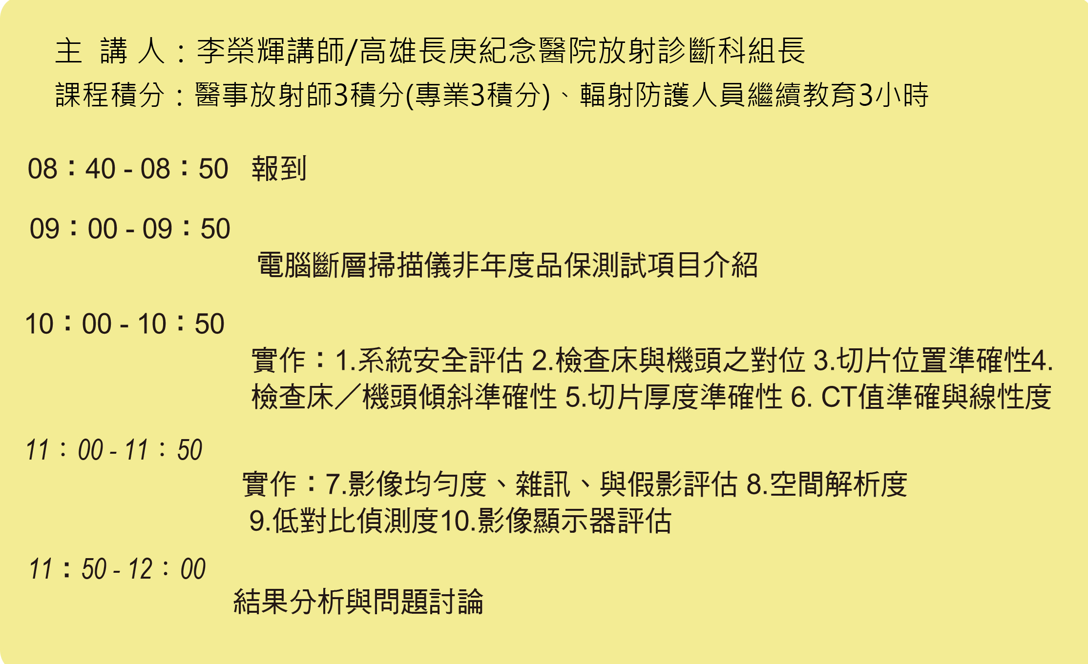 課程積分:醫事放射師3積分(專業3積分)、輻射防護人員繼續教育3小時