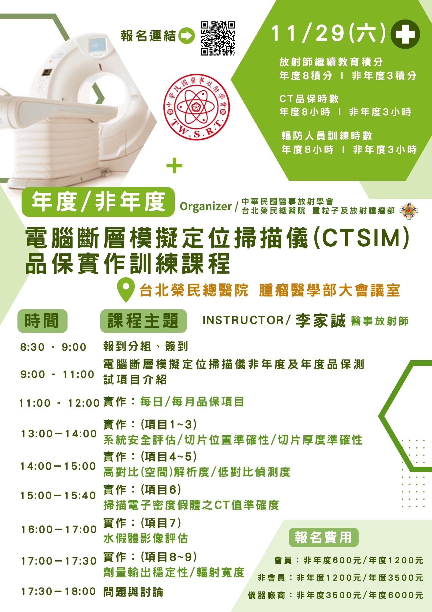 課程名稱:電腦斷層模擬定位掃描儀(CT SIM)年度暨非年度品保實作訓練課程