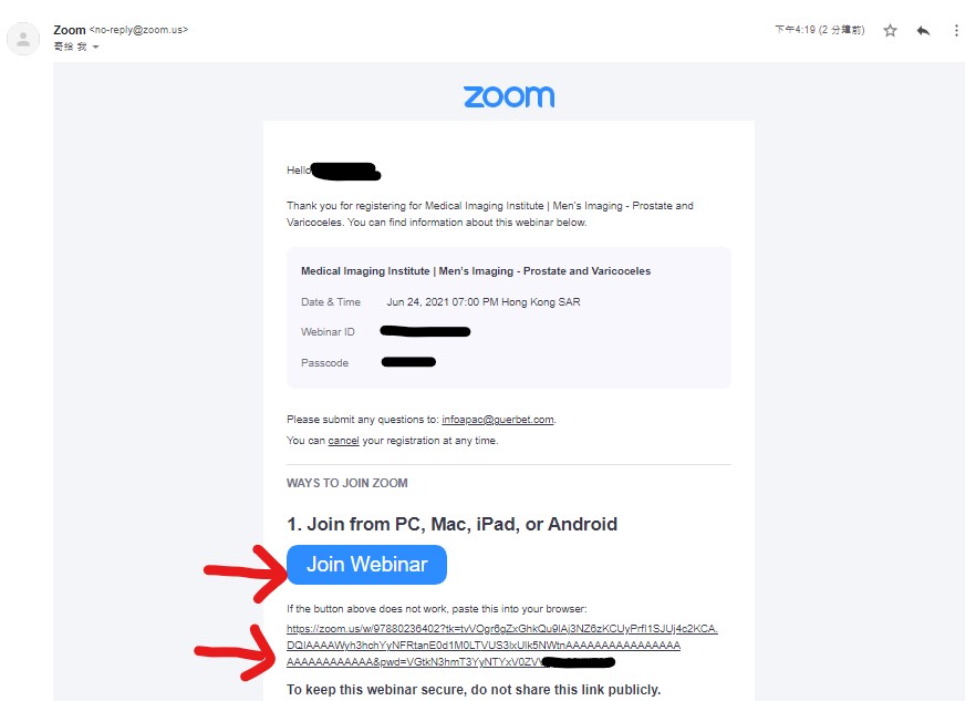至Guerbet網址註冊後,E-mail會收到連結( 示意圖 )(可能在垃圾信件),請使用收到的連結上課,才會有上線紀錄。如果還是沒有找到連結,請E-mail至Jenny.yang@guerbet.com,提供Email、註冊姓名、註冊單位,將會有專人處理。