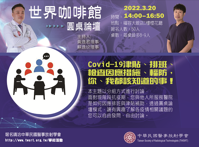 本次年會規劃了Covid-19疫情圓桌論壇,舉辦形式為由桌長帶領的分組討論形式進行,讓有興趣了解各疫情相關議題的您可以自由發問自由討論。