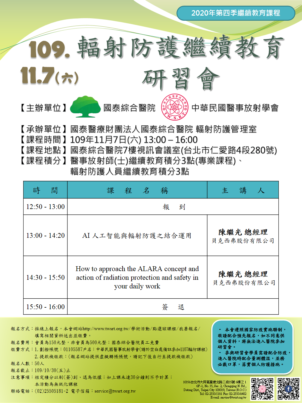 課程積分:醫事放射師(士)繼續教育積分3點(專業)、輻防人員繼續教育積分3點