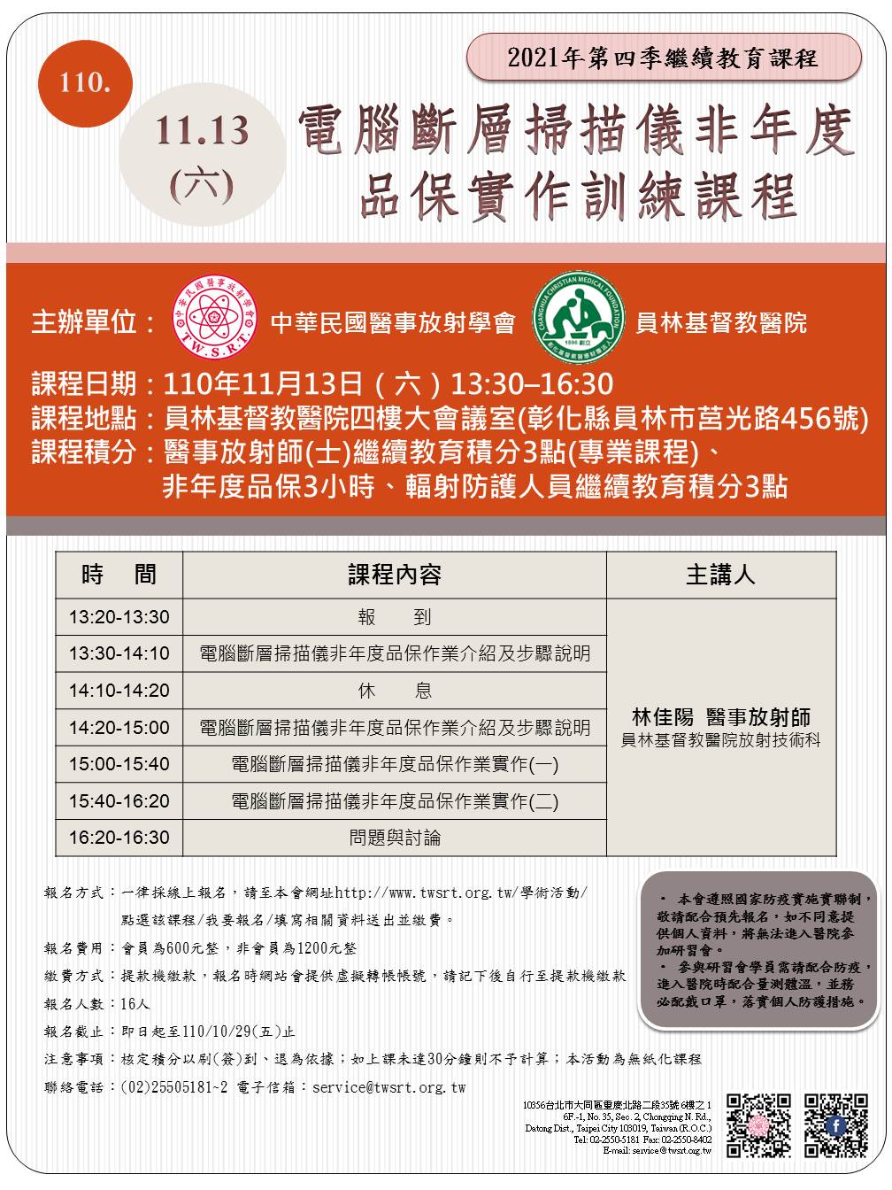 課程積分:醫事放射師(士)繼續教育積分3點(專業)、非年度品保3小時、輻防人員繼續教育積分3點
