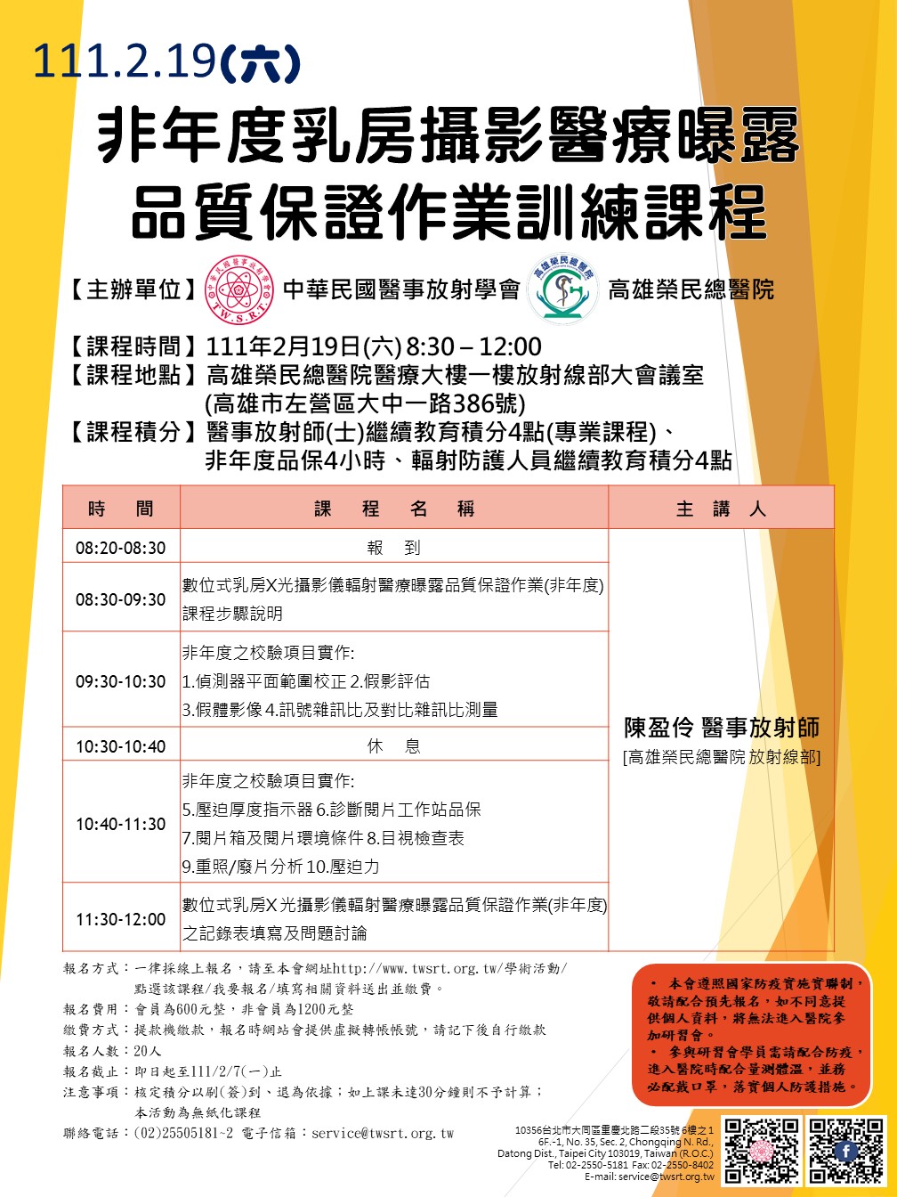 課程積分:醫事放射師(士)繼續教育積分4點(專業)、非年度品保4小時、輻防人員繼續教育積分4點